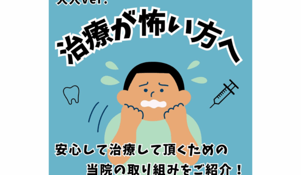 皆様は「歯医者」と聞くとどんなイメージをお持ちでしょうか? 私自身、病院にかかる際にお恥ずかしい話ではありますが、今でも医師の白衣姿を見るだけで少しドキドキしてしまいます。 歯科医院へ通われる患者さまの中には同じくらい、もしくはそれ以上に不安があったり緊張されていたりする方もお見えになるのではないかと思います。 そんな患者さまにも落ち着いて治療を受けていただけるように、「自分の家族、大切な人」へ説明するようしっかり説明し、当院のスタッフ一丸となり患者さまにしっかり対応してまいります。